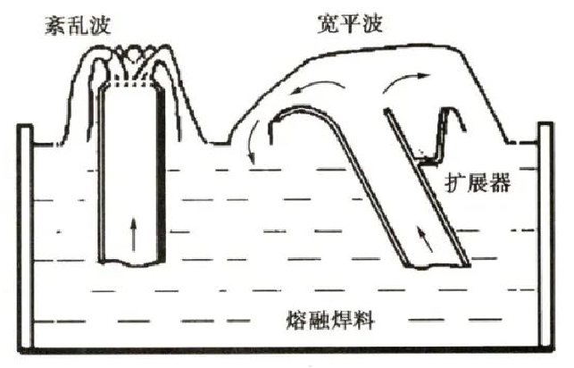 . 如下图所示,在焊料的喷嘴出口处安装了扩展器,熔融的铅锡熔液从倾斜的喷嘴喷流出来,形成偏向宽平波(也叫片波)。逆着印制板前进方向的宽平波的流速较大,对电路板有很好的擦游作用:在设置扩展器的一侧,熔液的波面宽而平,流速较小使焊接对象叮以获得较好的后热效应,起到修整焊接面、消除桥接和拉尖、丰满焊点轮廓的效果。