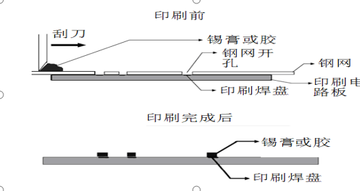刮刀移动使焊膏或胶进入钢网上开孔处的印刷电路板的焊盘上。焊膏或胶的厚度等于钢网厚度。