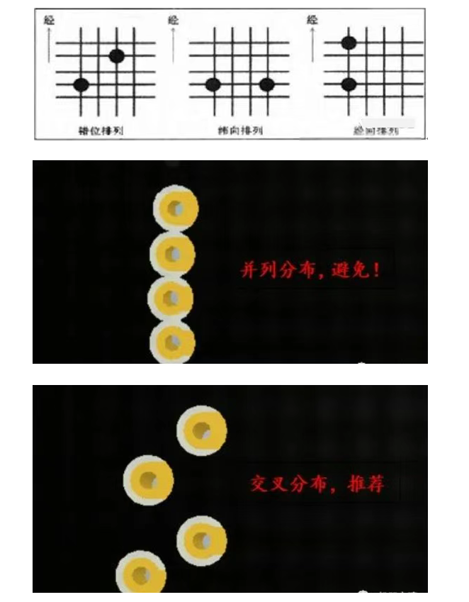 PCB设计中的孔排列方式对CAF性能有显著影响。错位排列、纬向排列和经向排列是三种基本的排列方式,它们对CAF性能的影响依次减弱。制造商在设计PCB时,应考虑孔的排列方式,通过优化孔的布局来减少CAF的发生,确保电子设备在各种环境条件下的稳定运行。