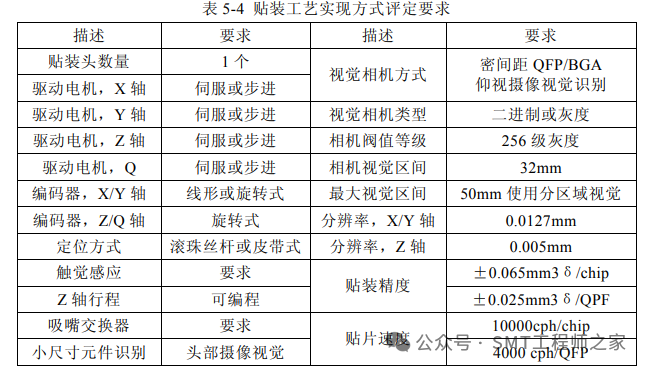 贴片机选择要求可以从PCB处理能力、贴装元件类型及范围、容纳元件供料器数量及类型和贴装要求等几个方面考虑。表5-2为从PCB处理、元件范围及元件供料器三个方面考虑一列举示例,表5-3为从贴装工艺要求方面考虑一列举示例,表5-4为贴装工艺实现方式评定要求,表5-5为贴装要求可靠性评定参数。