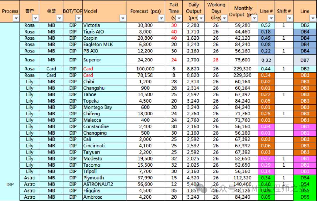 列出该线生产机种,按照FCST从大到小排列