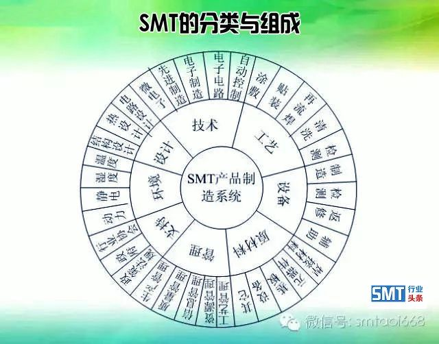 SMT由表面组装元器件、电路基板、组装设计、组装材料、组装工艺、组装设备、组装系统控制与管理等技术组成,是一项涉及微电子、精密机械、自动控制、焊接、精细化工、材料、检测等多种专业和多门学科的综合性工程科学技术。