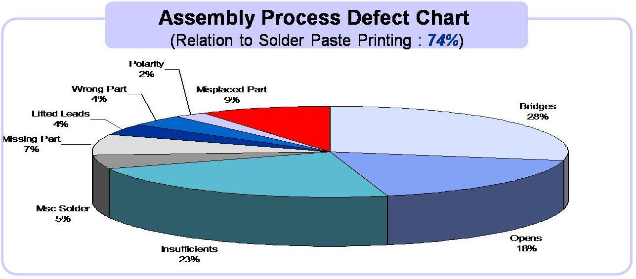 根据最新研究结果,印刷工艺有着大于60%的可变性,之所以存在这么大的可变性,是因为印刷工艺中包含大量不确定的工艺 参数,包括焊膏的种类、配方、环境条件、钢网的类型、厚度、开孔的宽厚比和面积比、印刷机等类型、 刮刀、印刷头技术、印刷速度等等。