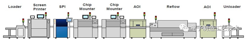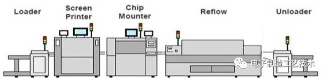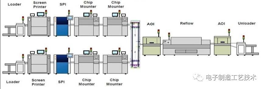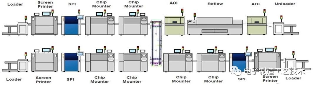 下图做手机主板较多的生产主流配置,注意回流焊温区要加长且双轨或细目网带进出板,炉膛内温度要实施在线监控。