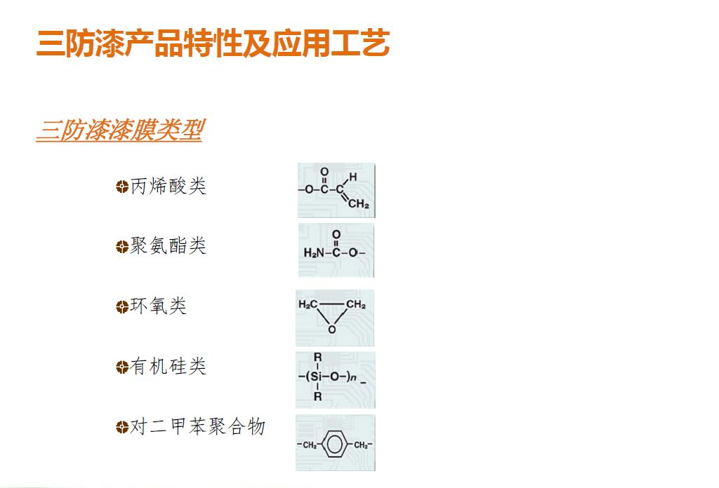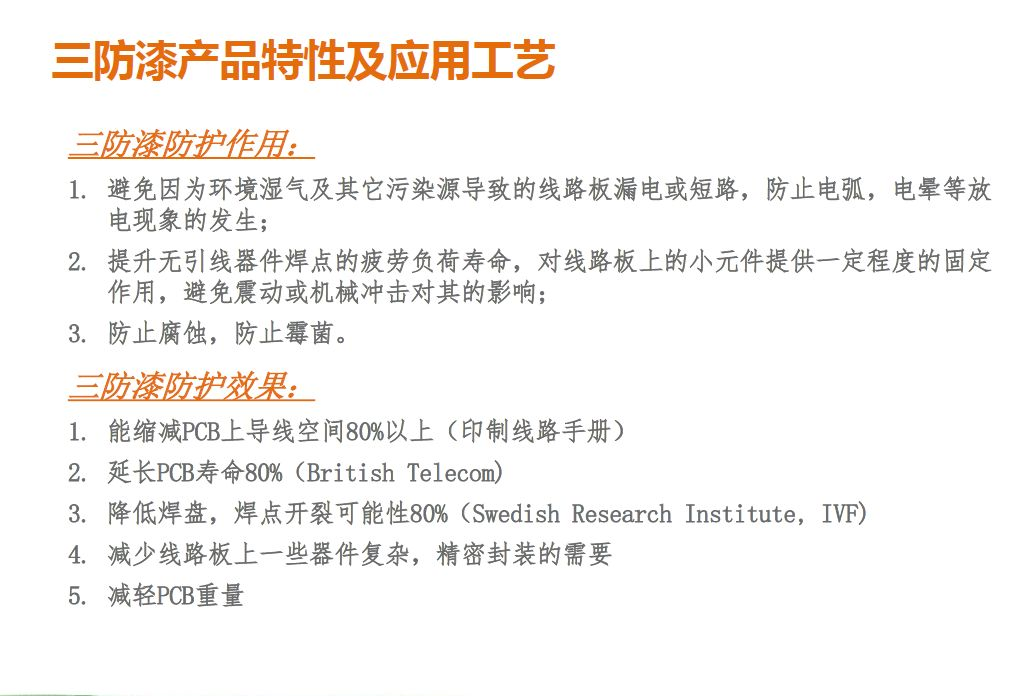 三防漆覆于线路板的外表,形成一层50-100微米厚的膜。它可在诸如含化学物质(例如:燃料、冷却剂等)、震动、湿气、盐雾、潮湿与高温的情况下保护电路免受损害。在这些条件下线路板可能被腐蚀、霉菌生长和产生短路等,导致未使用三防漆的电路出现故障。