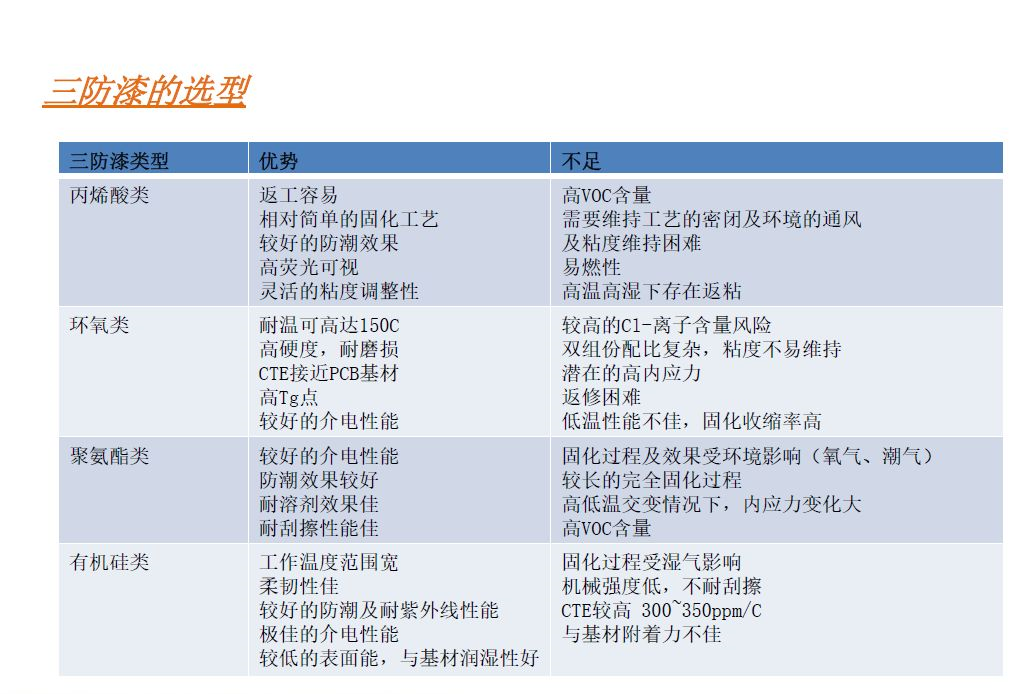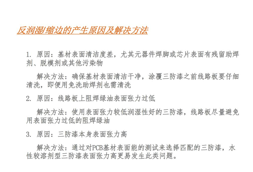 解决的办法主要是检查生产环境,如温湿度;减小固化前流平挥发区域的排放量;降低三防漆粘度;减小炉温曲线爬坡坡度;使用挥发速度较慢的稀释剂。