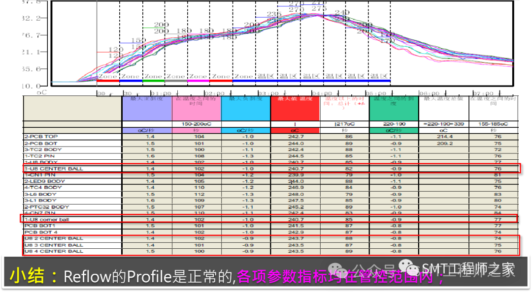 5、Reflow的各箇蔘數也密切影響著焊接狀況,如蔘數異常也會造成枕焊異常,故確認當日生産Profile(圖可放大)如下;