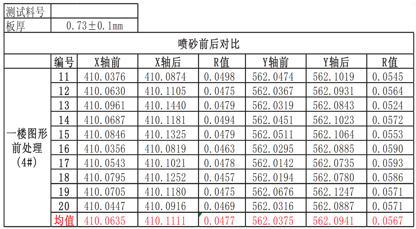 刷磨: 闆子研磨兩次與研磨一次的變化較小,均呈漲的趨勢,X軸漲0.000%-0.004%,Y軸漲0.001%-0.005%。