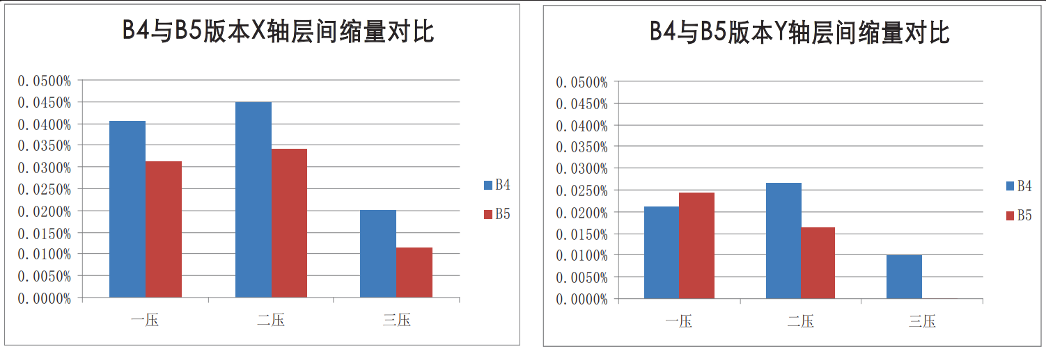 壓閤: 基闆漲縮變化, 造成成品尺寸變化:某主闆B5版本較B4每次壓閤的縮量減少約0.01%,從而導緻外層比例上陞,如下圖所示:
