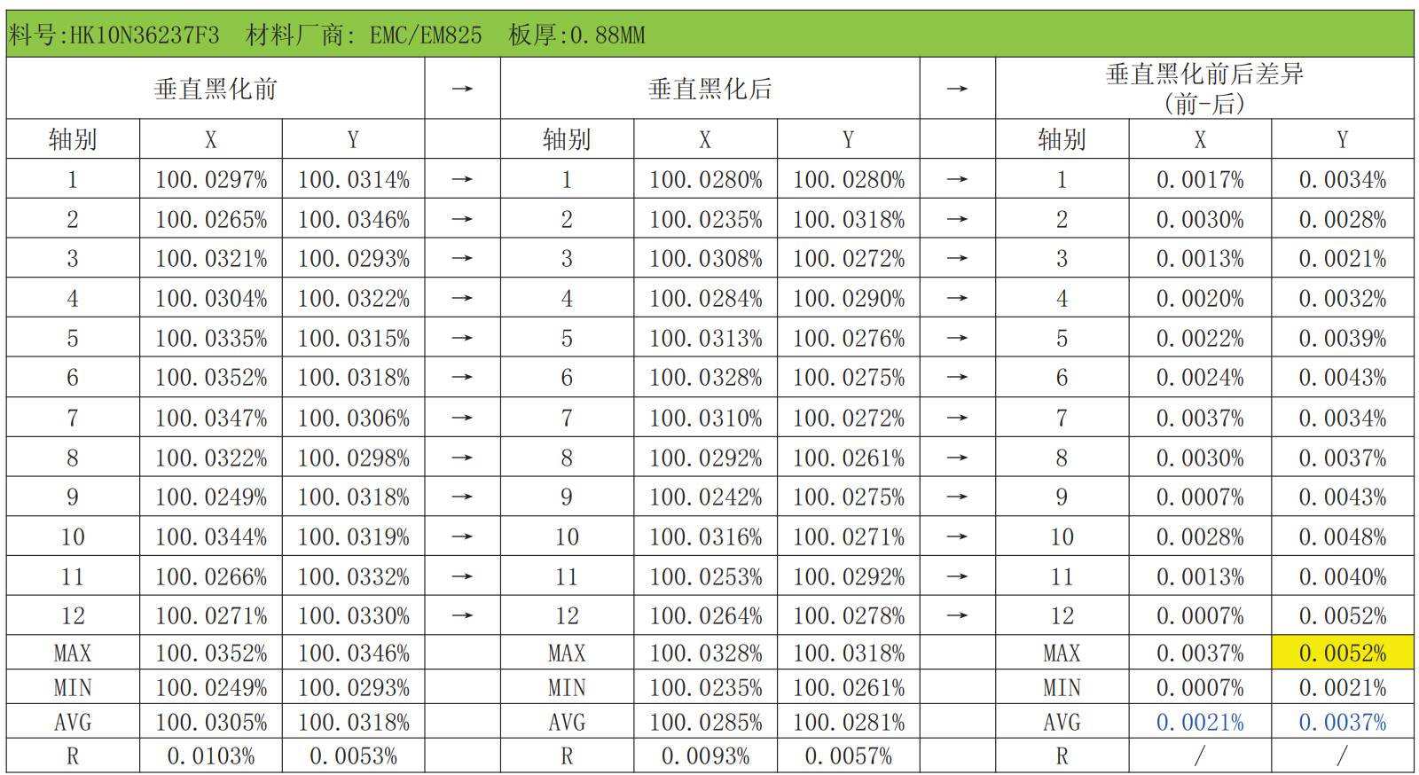 黑化前後班子的尺寸比例變化約0.003%,如下錶所示。