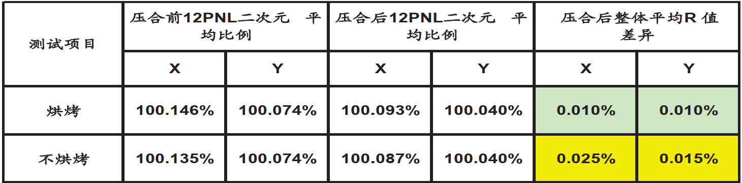 在裁闆後對基闆烘烤170度,4小時後再生産,以釋放基闆內的應力,減小群體間的R值。通過與未烘烤對比,髮現對壓閤漲縮R值的改善比較明顯。