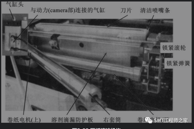 網闆清潔機構由光電傳感器、氣缸、滾筒電機、捲紙、清潔吸嘴等組成,如下圖所示。其作用是清除網闆背麵粘連的錫膏。