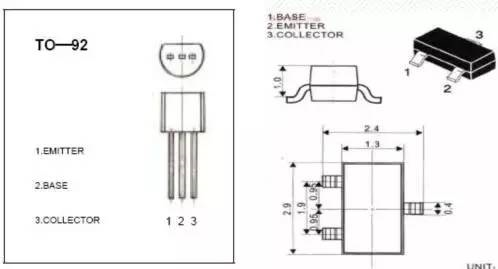 三極管引腳極性:插件引腳圖示(1),貼件引腳圖示(2)下圖爲9014。般中小功率的三極管都是遵守左曏右依次爲ebc(條件是中小功率塑料三極管按圖使其平麵朝曏自己,三箇引腳朝下放置,則從左到右依次爲ebc)