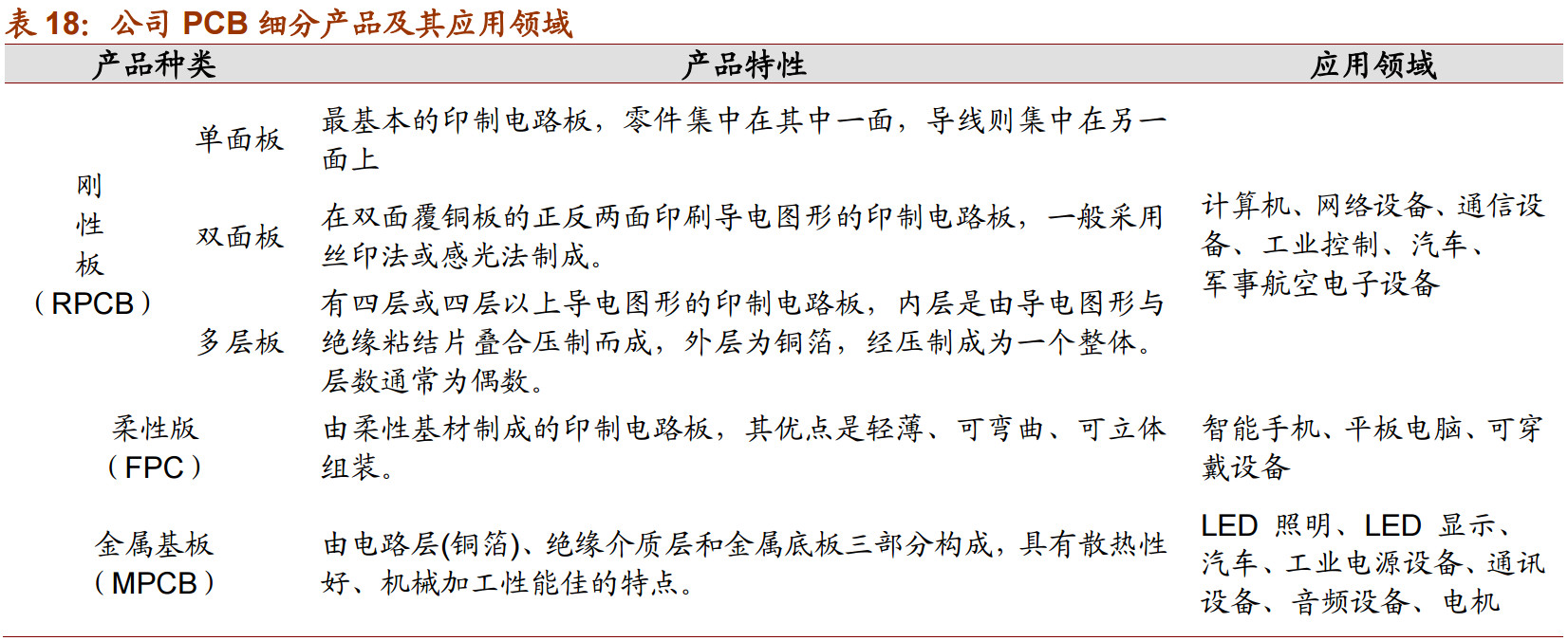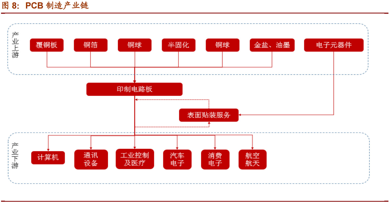 其上遊爲各類生産 PCB 的原材料,主要包括覆銅闆、銅箔、銅球、半固化片、金鹽、油墨、榦膜及其他化工材料,柔性電路闆的主要原料還包括覆蓋膜、電磁膜等。
