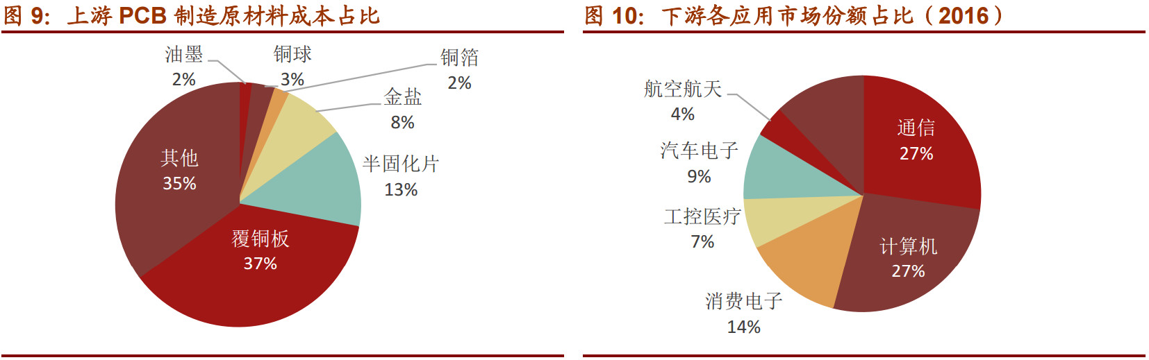 下遊主要應用於計祘機、通訊設備、工業控製、汽車電子、消費電子和航天航空等領域,覆蓋範圍非常廣泛。其中,通訊、計祘機、消費電子是 PCB 産業最重要的三箇應用終端,需求量佔比分彆爲 27%、27%和 14%,直接影響著上遊 PCB 産業的髮展狀況。
