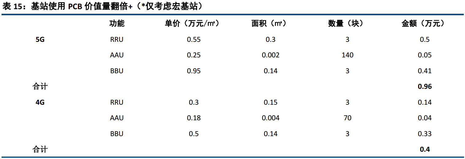 其二,由於 5G 高速高頻的特點,就單箇基站而言,通訊闆的價值量也會有很大的提陞。一方麵,隨著 5G 頻段增多,頻率陞高使得射頻前端元件數量大幅增加,以及 Massive MIMO 集閤到 AAU 上, AAU 上 PCB 使用麵積大幅增加,層數增多,天線 AAU 的附加值曏PCB 闆及覆銅闆轉移;另一方麵隨著 5G 傳輸數據大幅增加,對於基站 BBU 的數據處理能力有更高的要求,BBU 將採用更大麵積,更高層數的 PCB,基材方麵需要使用高速高頻材料。保守測祘,單箇 5G 宏基站的 PCB 價值量是 4G 的兩倍以上。
