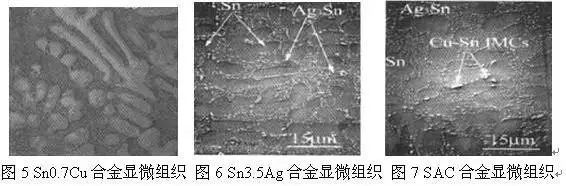 釺焊時焊料中的錫與焊盤母材反應生成以Cu6Sn5爲主的金屬間化閤物從而實現連接。焊點質量不但與界麵化閤物有關,而且與閤金基體顯微組織也有關。Sn0.7Cu閤金熔點爲227℃,組織相對比較穩定,在β-Sn基體上分佈着Cu6Sn5,由於熔點較高很少作爲焊膏使用,主要應用於波峰焊中。Sn3.5Ag閤金熔點爲221℃,組織相對穩定,在β-Sn基體上分佈着Ag3Sn金屬間化閤物,起着固溶強化作用,塑性良好,但價格偏高。