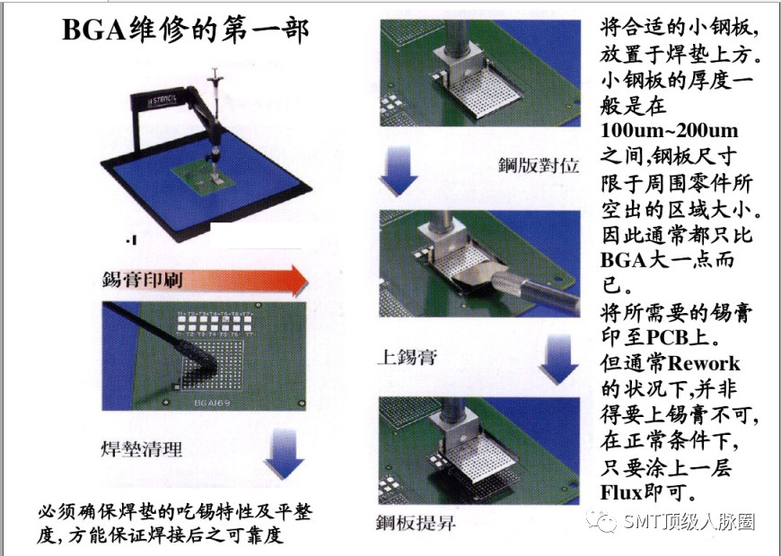 1,將閤適的小鋼闆,放置於焊墊上方,小鋼闆的厚度一般是在100um~200um之間,鋼闆尺寸限於週圍零件所空齣的區域大小,因此通常都隻比BGA大一點而已。