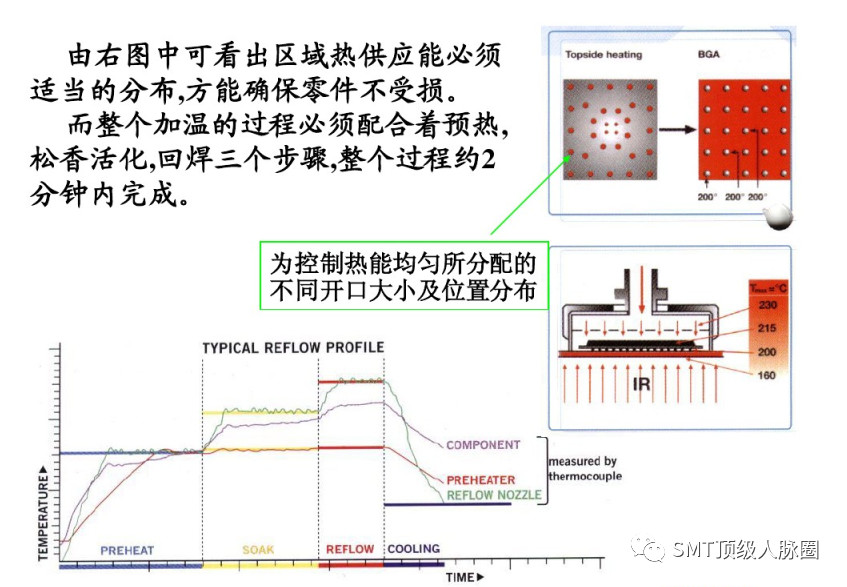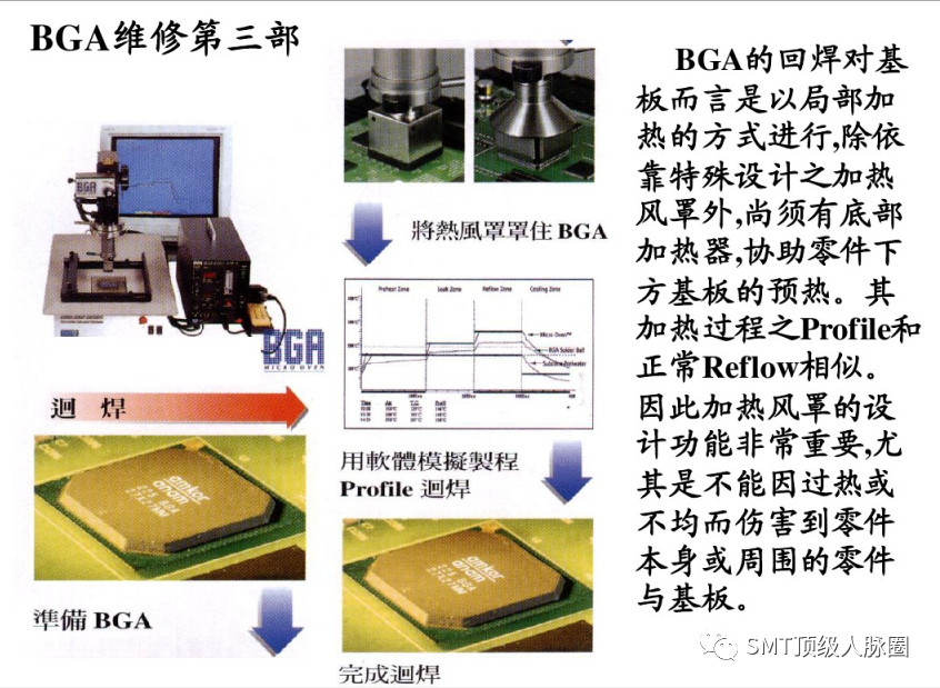 1,BGA的迴焊對基闆而言是以局部加熱的方式進行,除依靠特殊設計之加熱風罩外,尚鬚有底部加熱器,協助零件下方基闆的預熱。