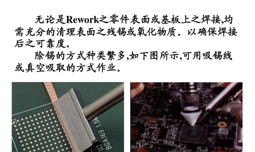 無論是Rework之零件錶麵或基闆上之焊接,均需充分的清理錶麵之殘錫或氧化物質。以確保焊接後之可靠度。除錫的方式種類繁多,如下圖所示,可用吸錫線或真空吸取的方式作業。