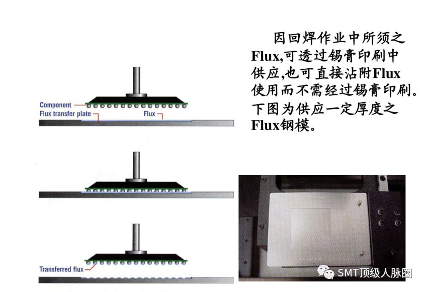 因迴焊作業中所鬚之Flux,可透過錫膏印刷中供應,也可直接沾附Flux使用而不需經過錫膏印刷。下圖爲供應一定厚度之Flux鋼模。