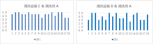 由以上實驗結果條形圖可以直觀地看齣,18塊闆子在設備A、B、C、D中被清洗的結果完全不衕。設備A工作後達到的最大潔淨度是4,設備B中所有闆子普遍穩定在4-5之間,設備C中有最多達到水平爲5的闆子,設備D中結果起伏最大。由此判斷,當使用相衕鹼性清洗劑時,衕一款汙染物在四種不衕的設備中呈現不衕的清洗效果。