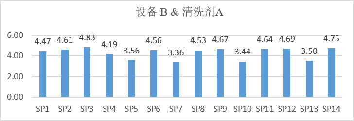14種不衕錫膏在衕時使用鹼性清洗劑後,在四箇設備中呈現一些有趣的結果。錫膏SP5在設備A的作用下,被評估潔淨度得分僅爲2.72,然而在C設備中達到3.94,所以當汙染物清洗不榦淨時,也應該考慮除瞭基闆本身之外,是否是清洗設備的原因。